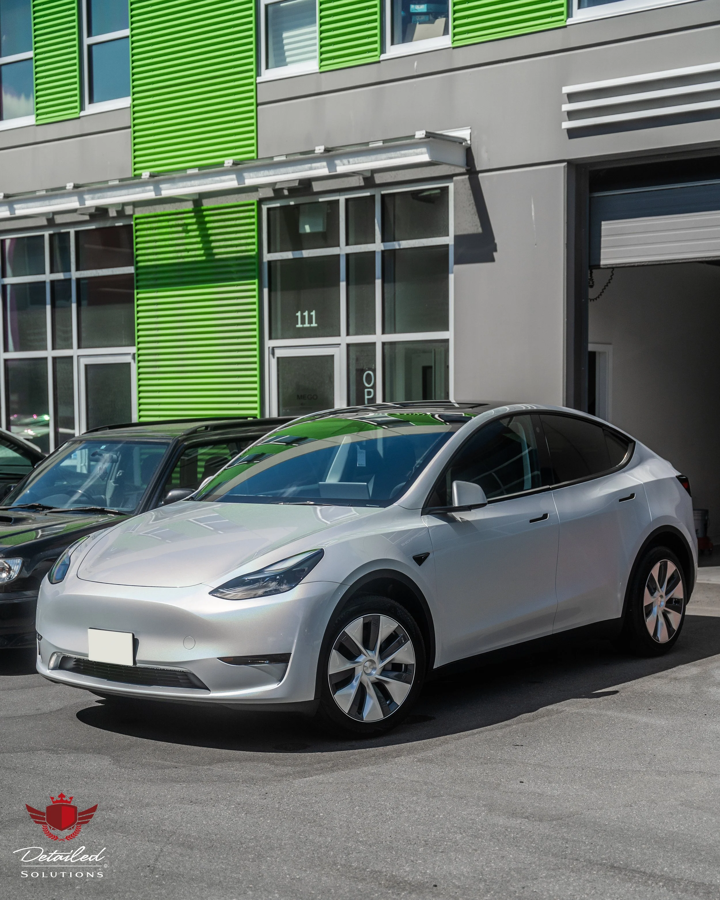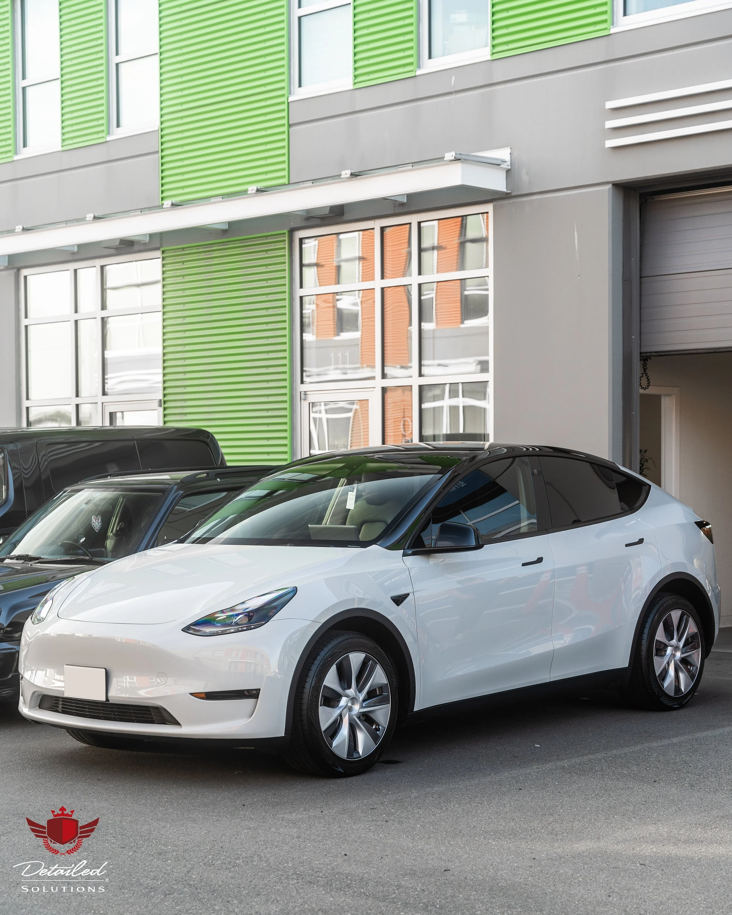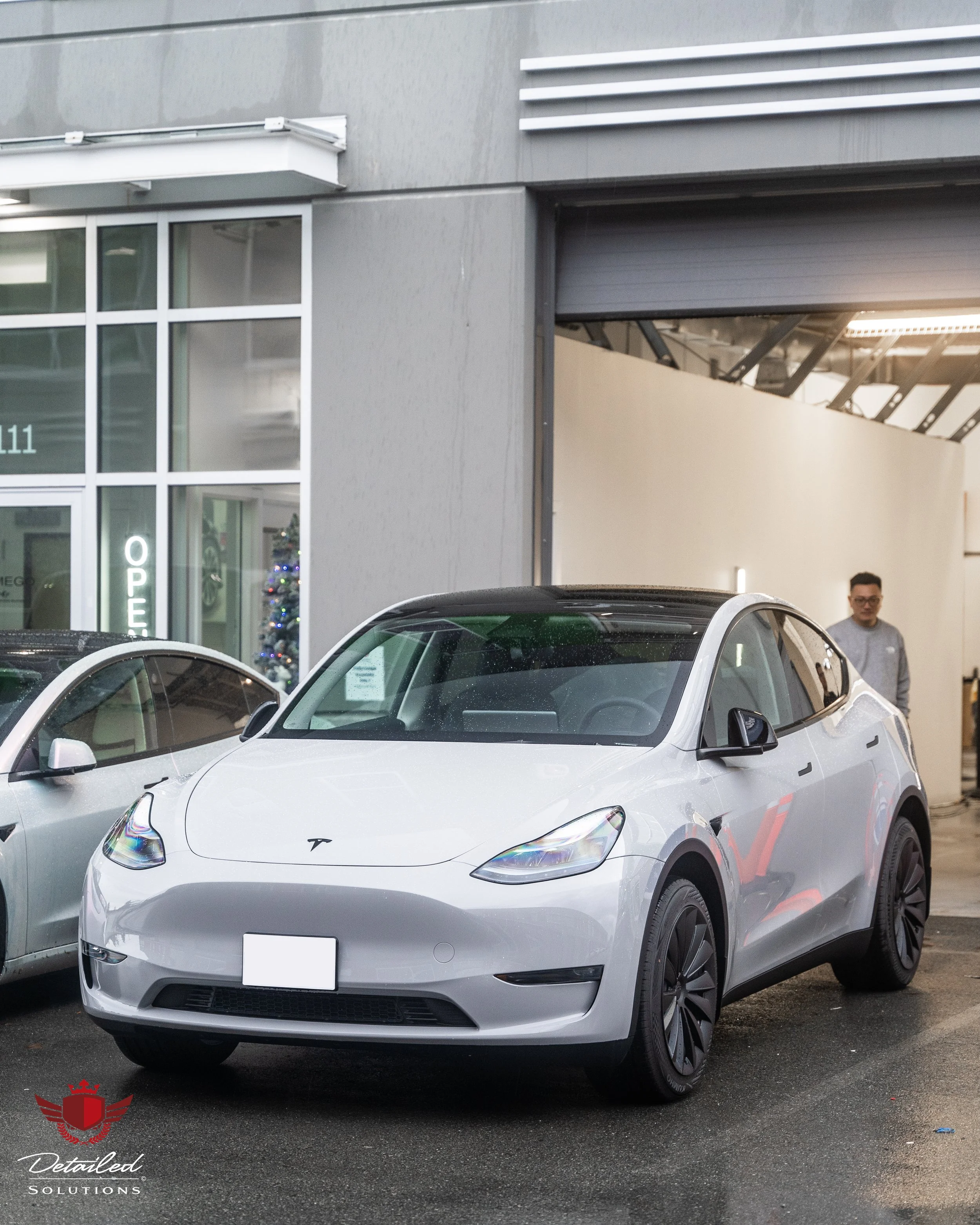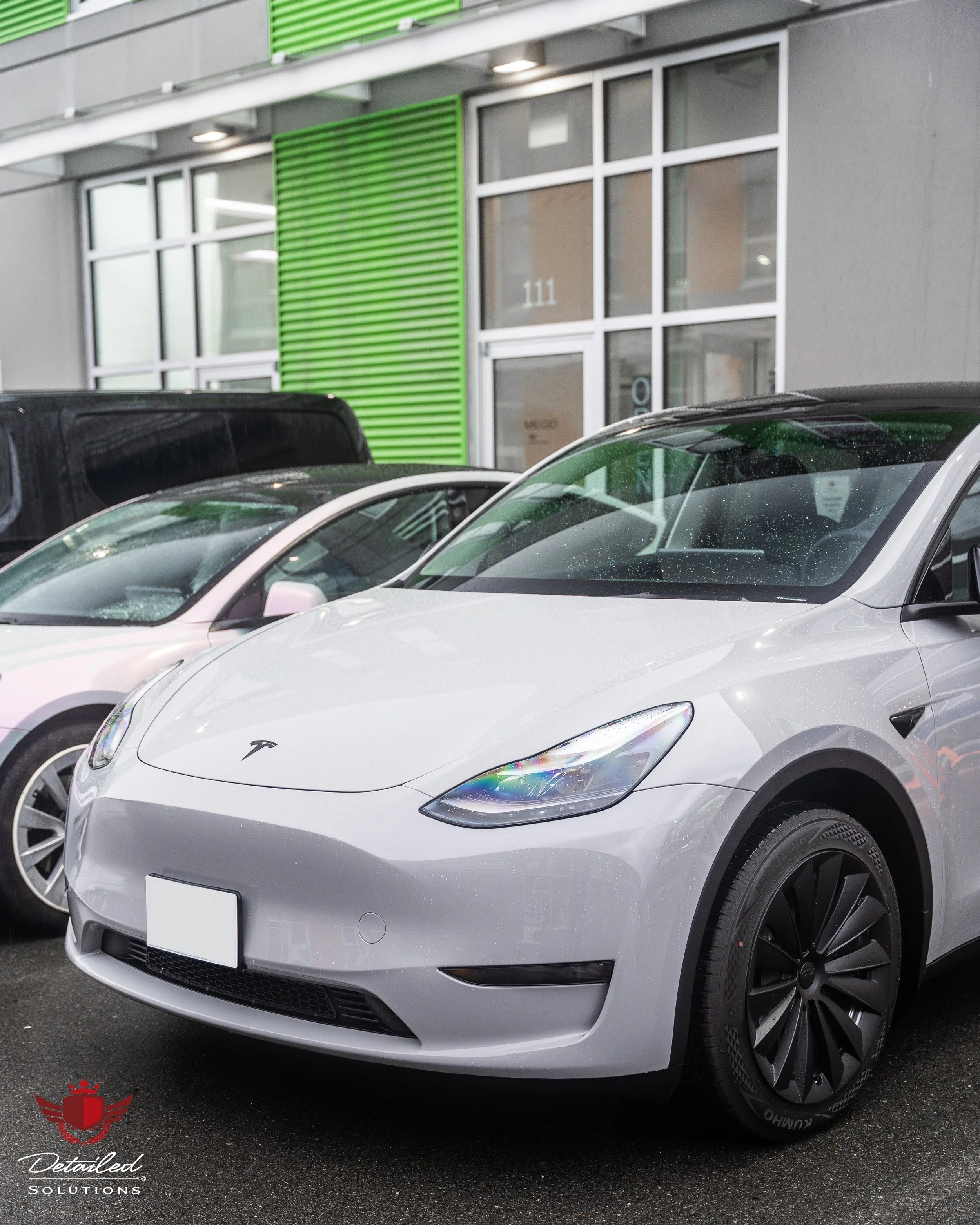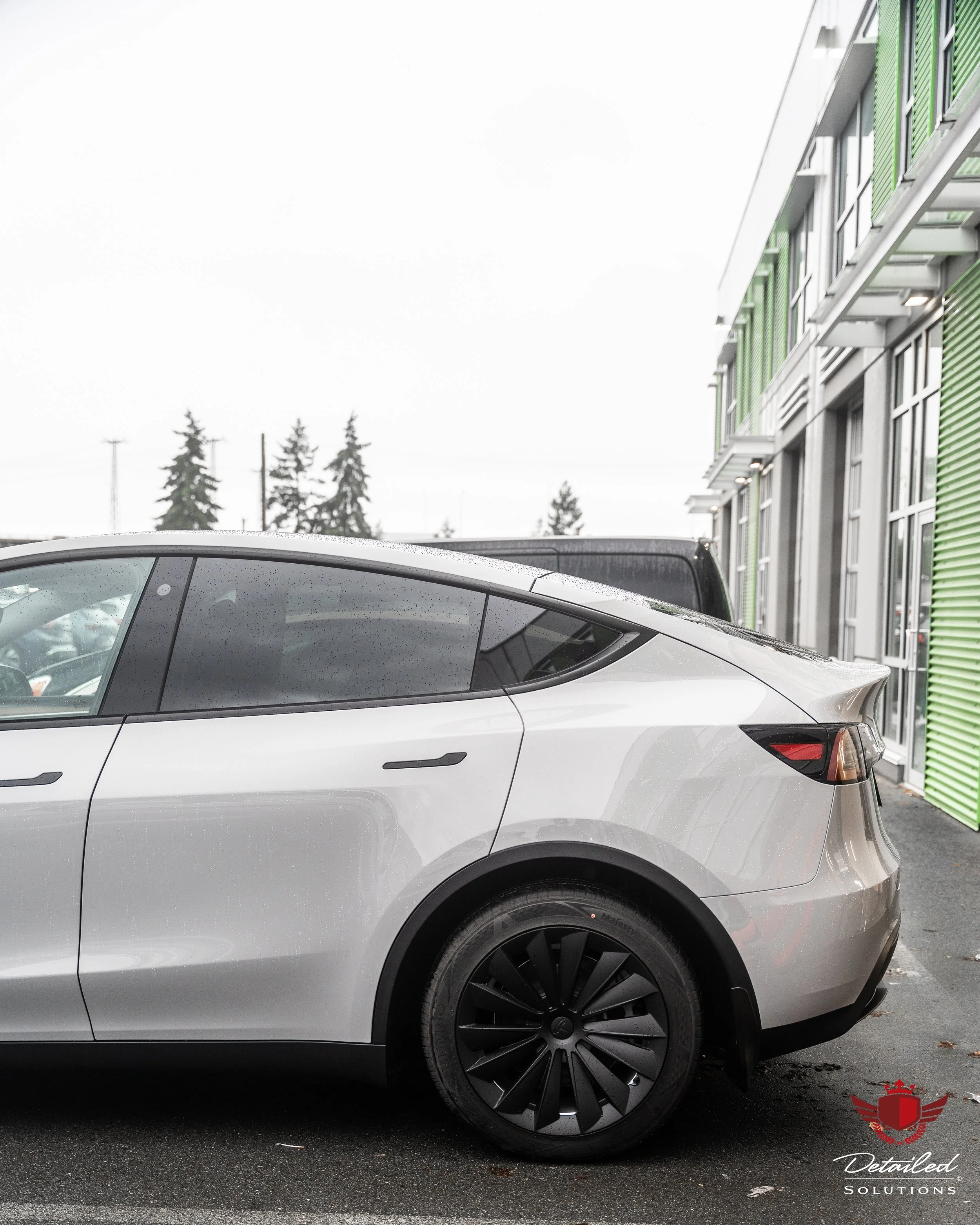 This Model Y is wrapped in a colour called Chalk. It’s a very light grey colour commonly seen on new Porsches. Gloss Black PPF was used for the pillars (top of the vehicle) and side view mirrors. Stunning!!
